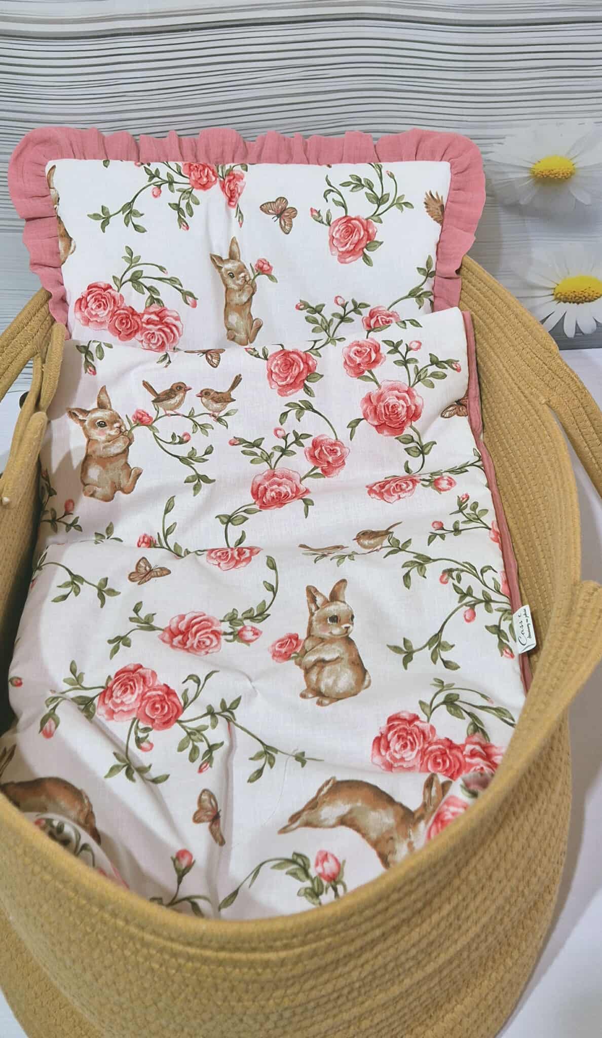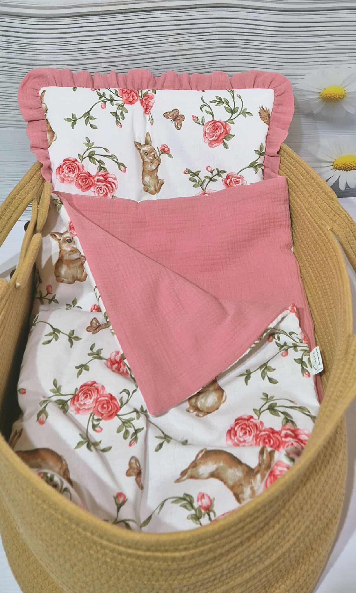 Kołderka uszyta z bawełny 100%. Wypełnienie kołderki stanowi włóknina silikonowa o właściwościach antyalergicznych, zapewniająca odpowiednią termoregulację co zagwarantuje spokojny sen maleństwa. Dzięki zszyciu wypełnienia z kołderką, wsad nie przemieści się podczas użytkowani i prania.