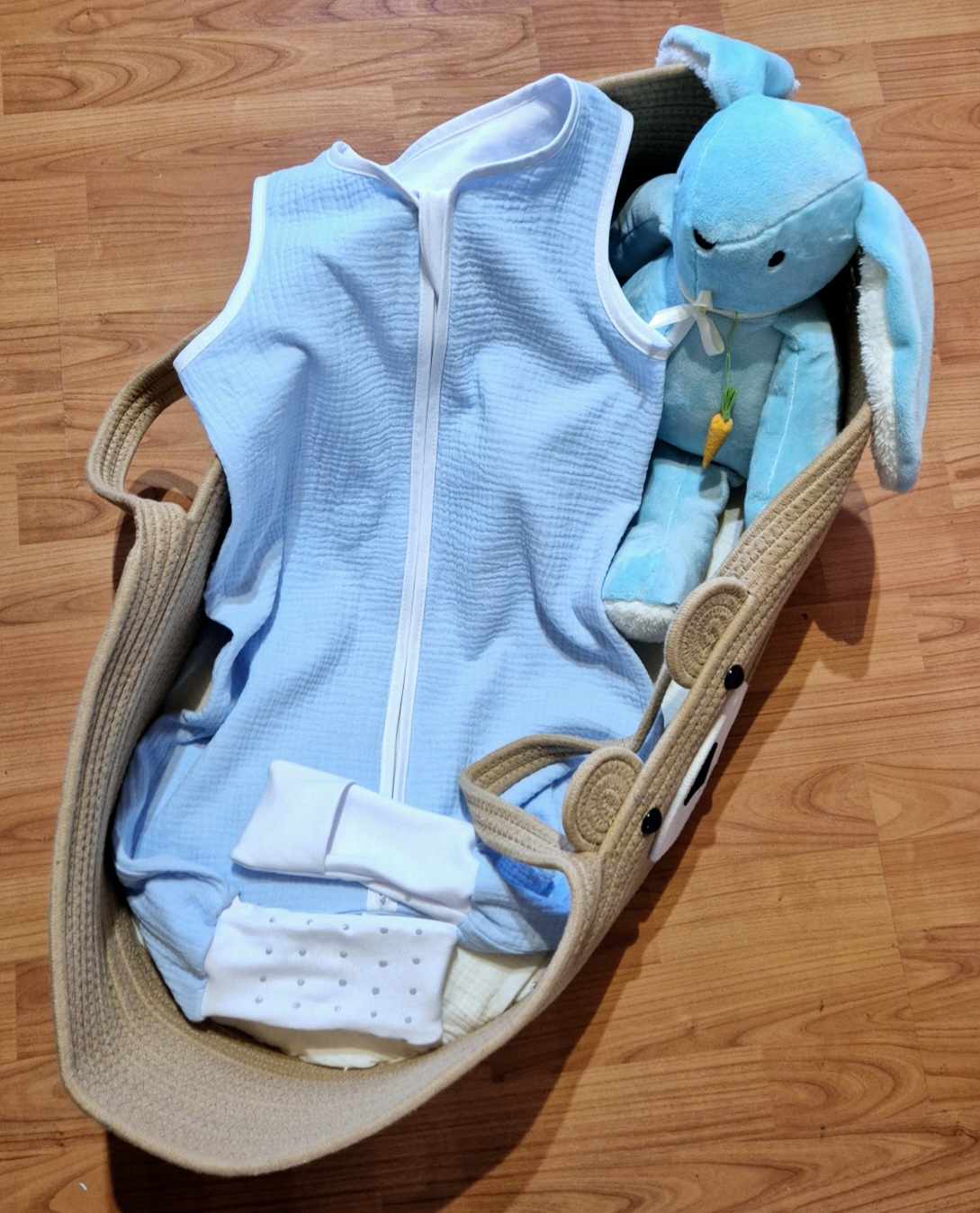 Śpiworek uszyty z Muślinu i Jerseyu bawełnianego oraz ocieplenie w środku z włókniny antyalergicznej .