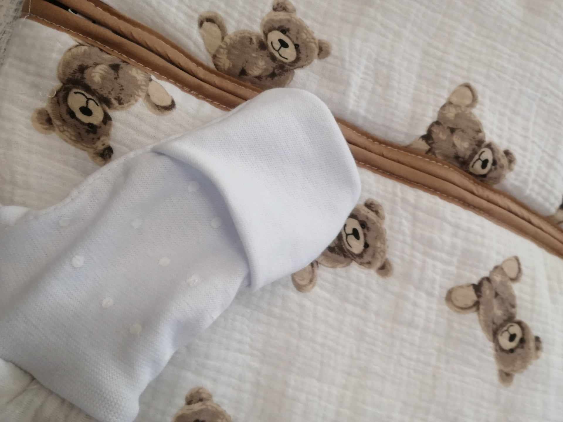 Śpiworek uszyty z Muślinu i Jerseyu bawełnianego oraz ocieplenie w środku z włókniny antyalergicznej .