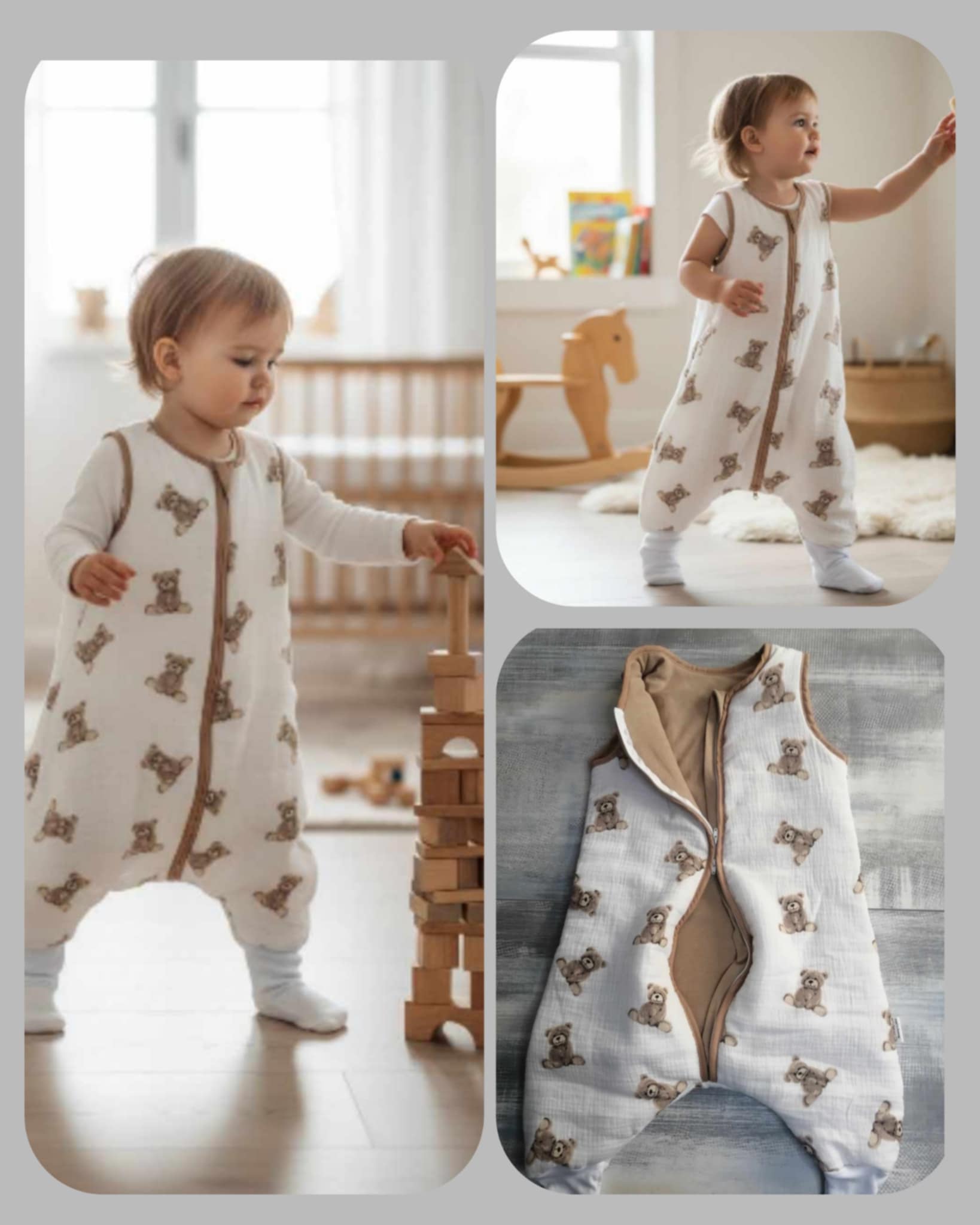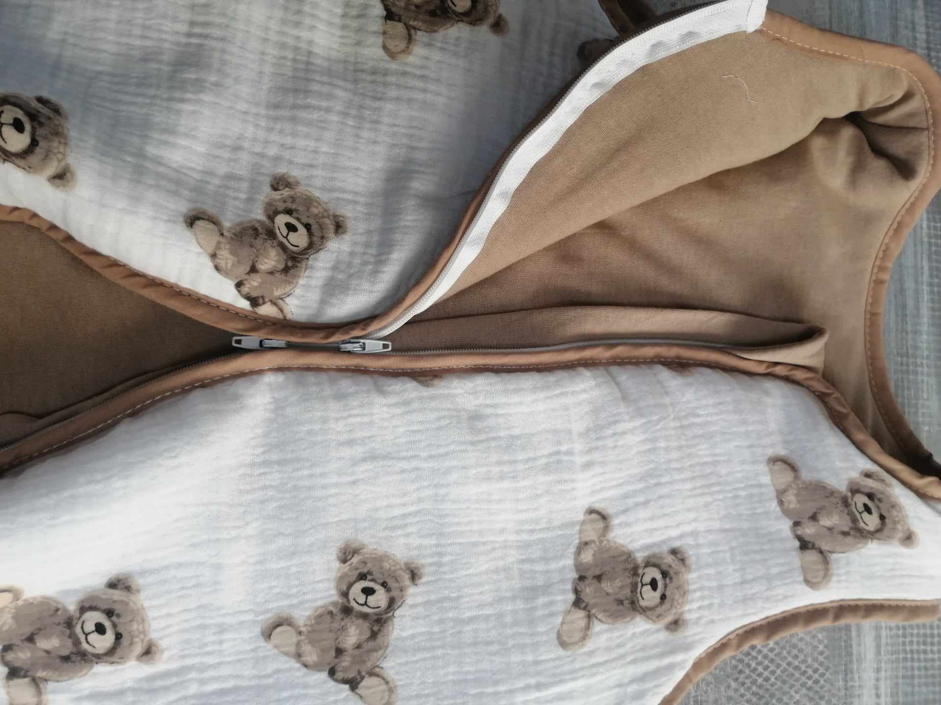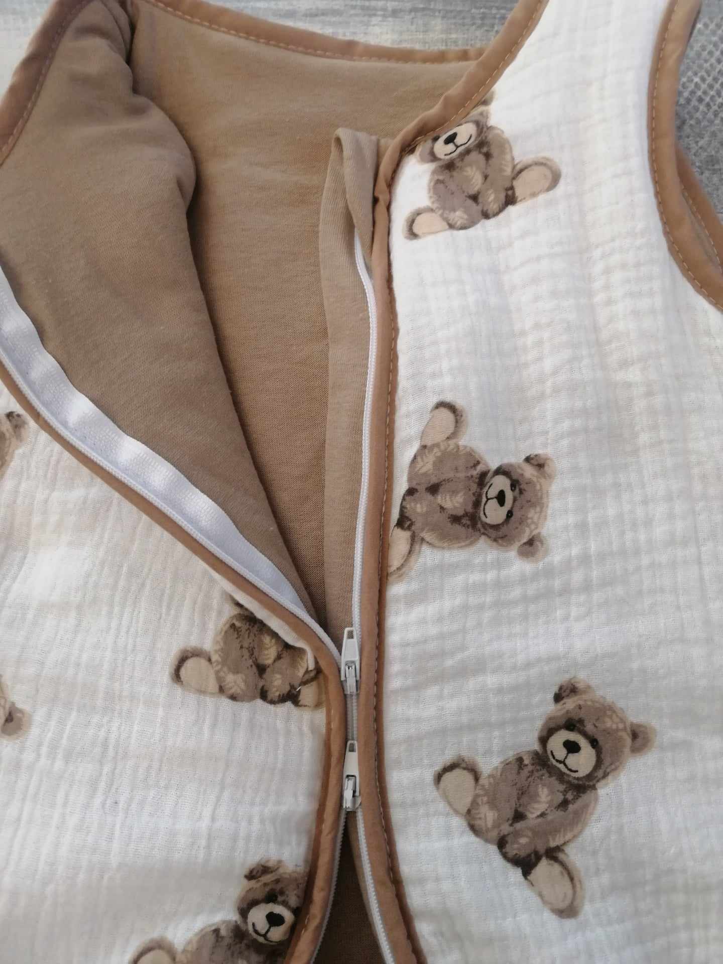 Śpiworek uszyty z Muślinu, W 1,5 tog i 2,5 tog -wypełnienie antyalergiczna włóknina silikonowa. 1 tog 2 warstwy bez ocieplenia .0,5 tog 1 warstwa materiału (zalecany na gorące noce i dni aby nie przegrzać dziecka)