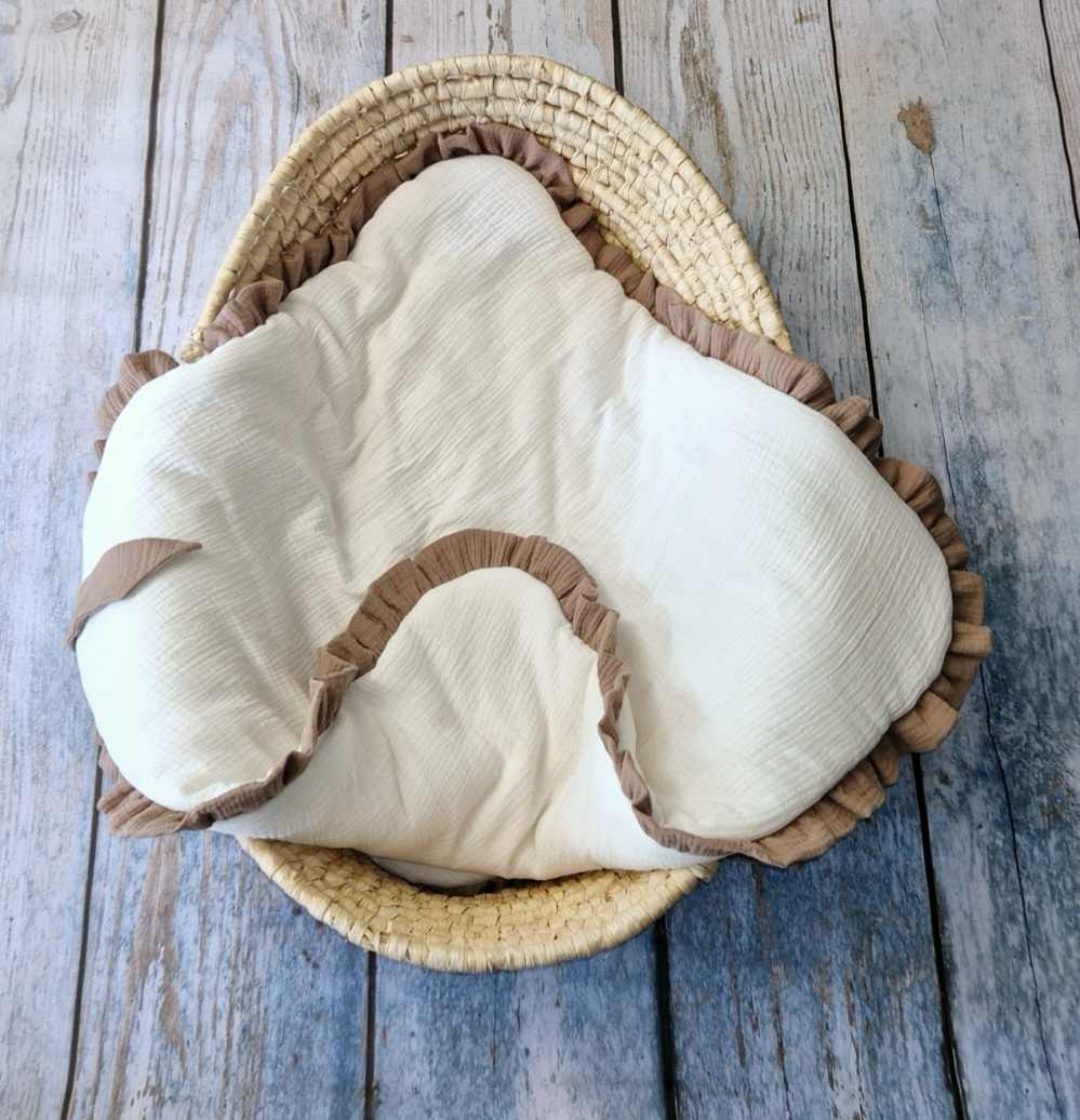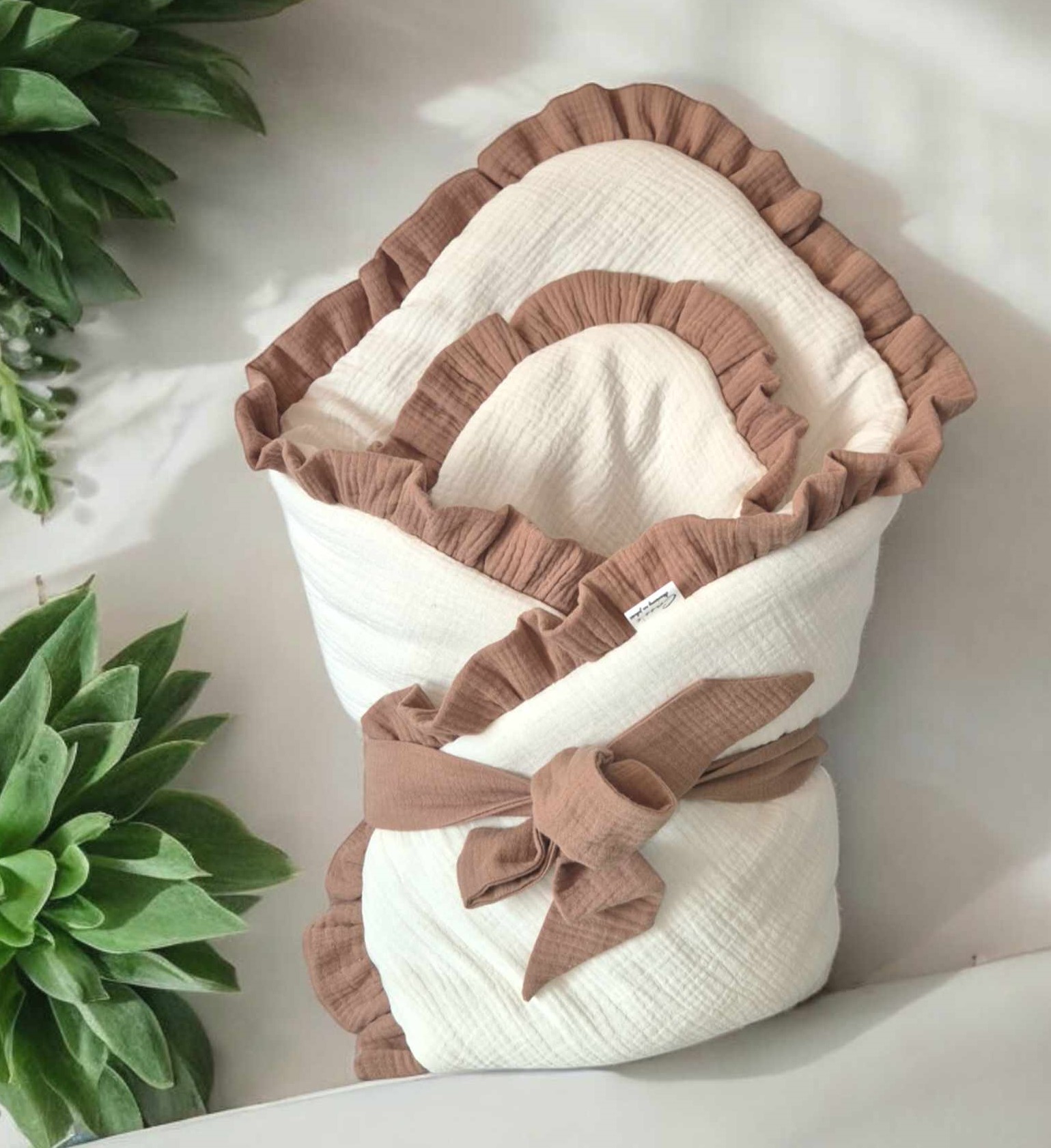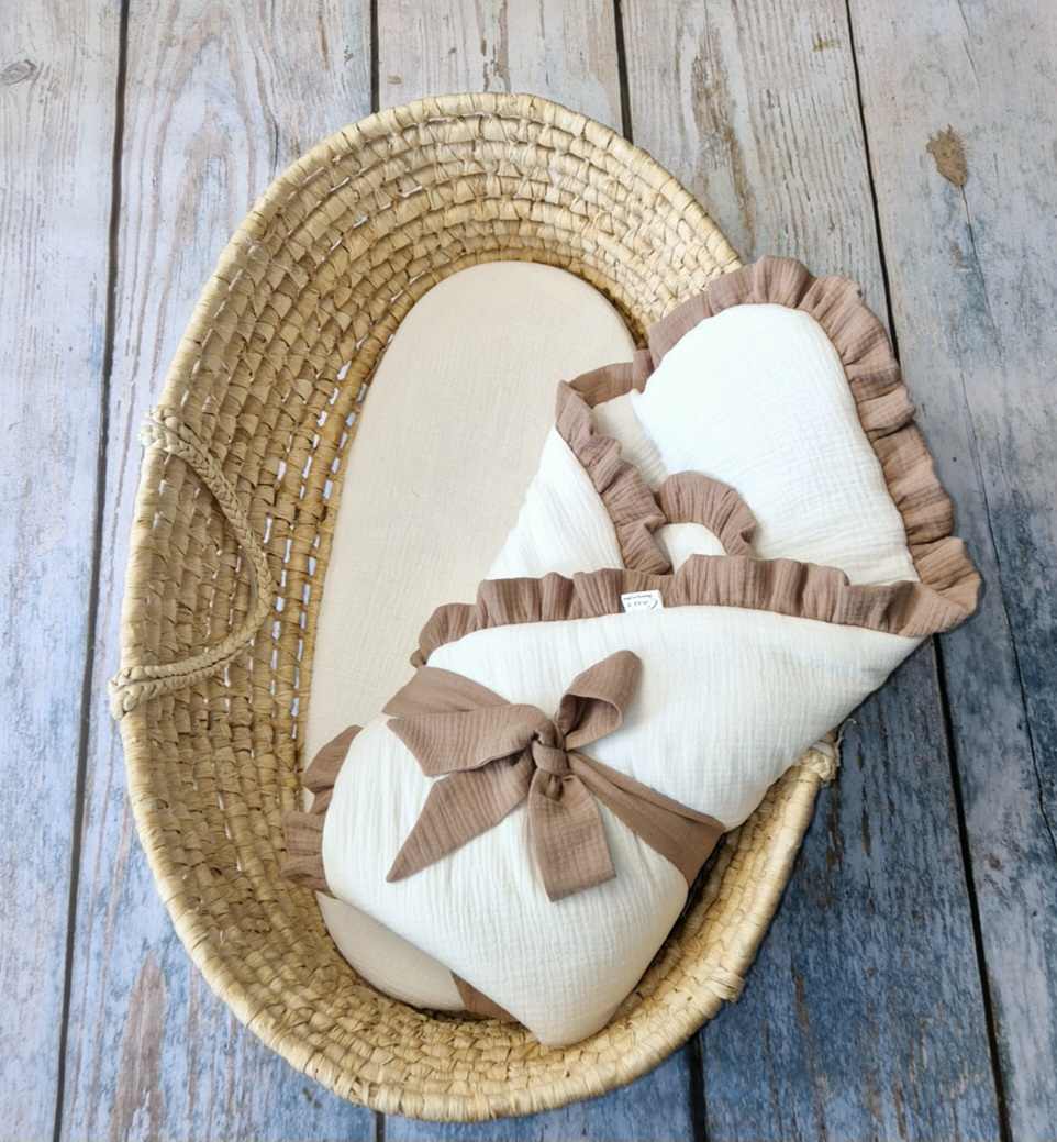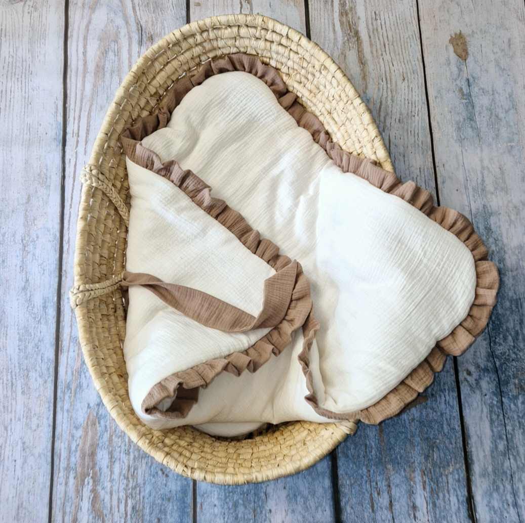 Śliczny Rożek niemowlęcy uszyty z muślinu  . Ozdobiony falbanką, wiązany ozdobną szarfą Może posłużyć jako kocyk lub mata . Wymiary rożka 75×75