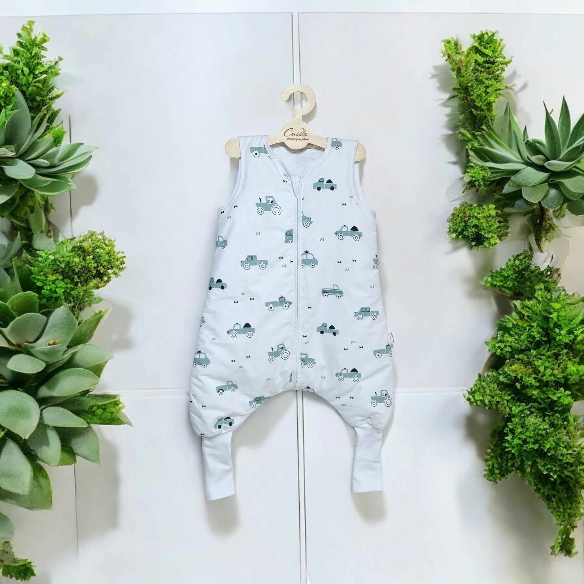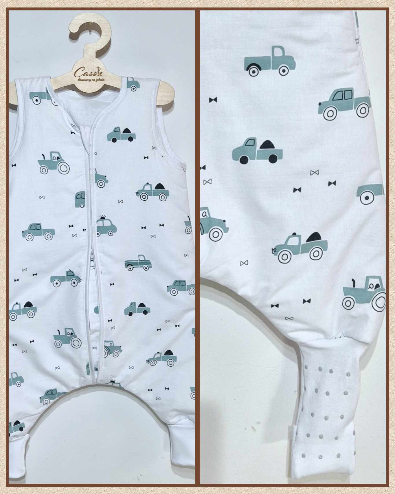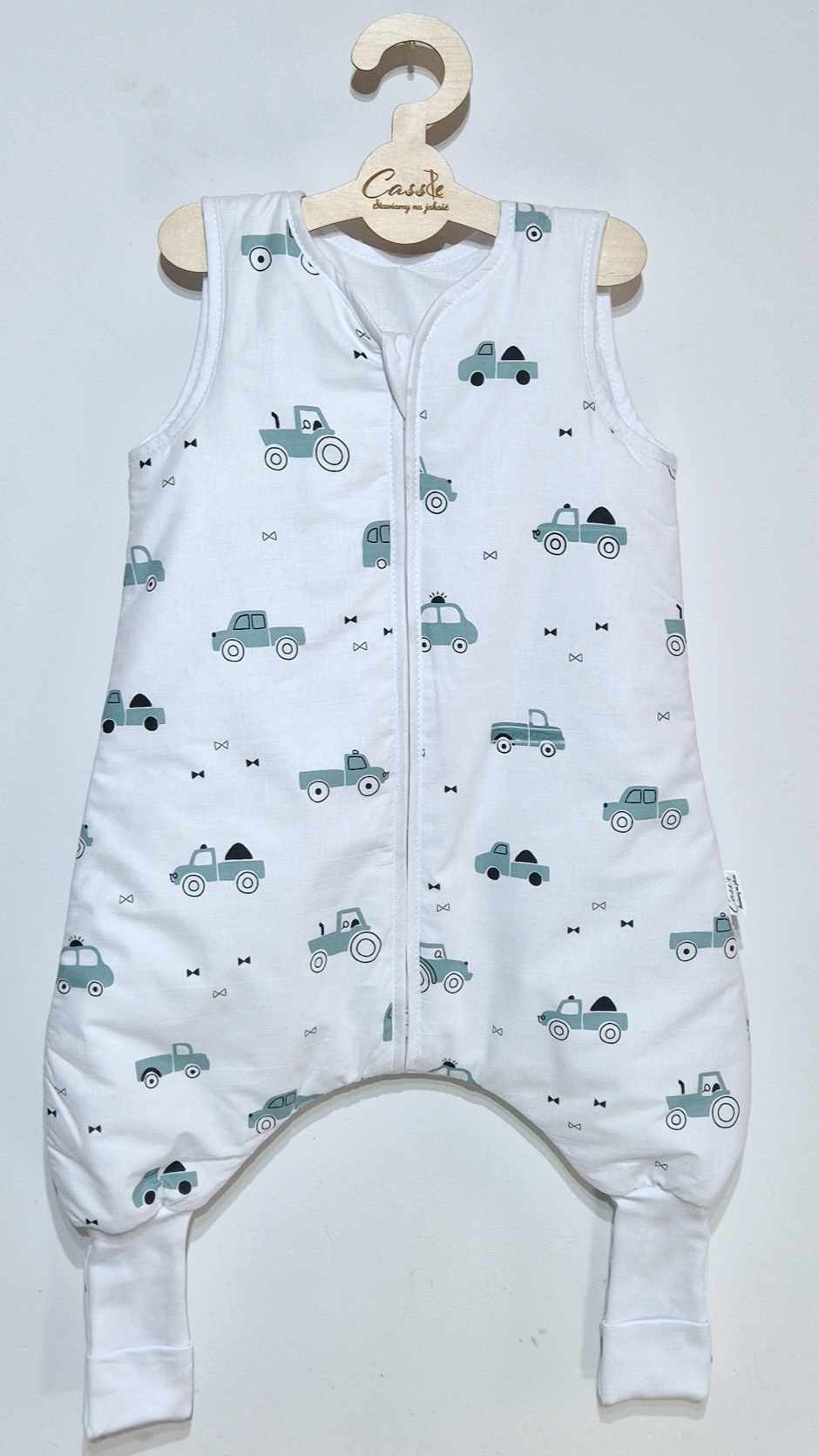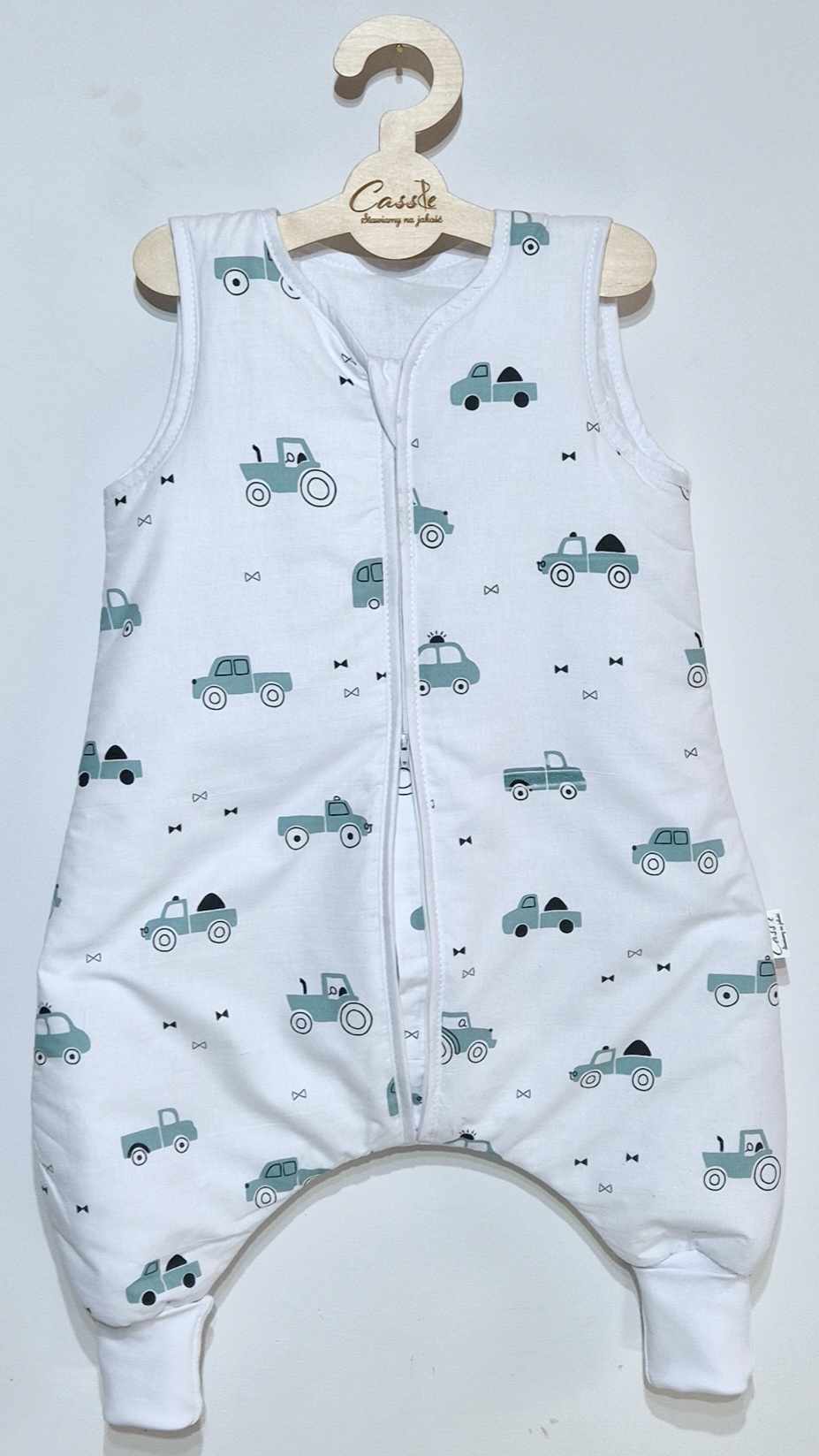 Śpiworek z nogawkami wzór-Autka Oliwkowe