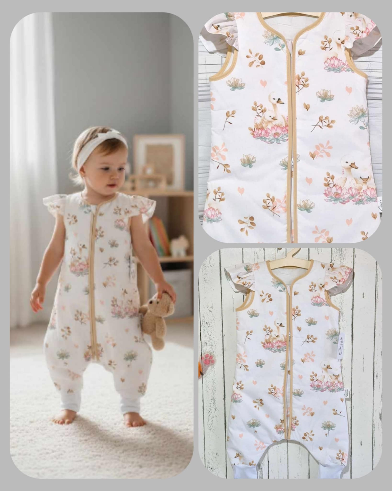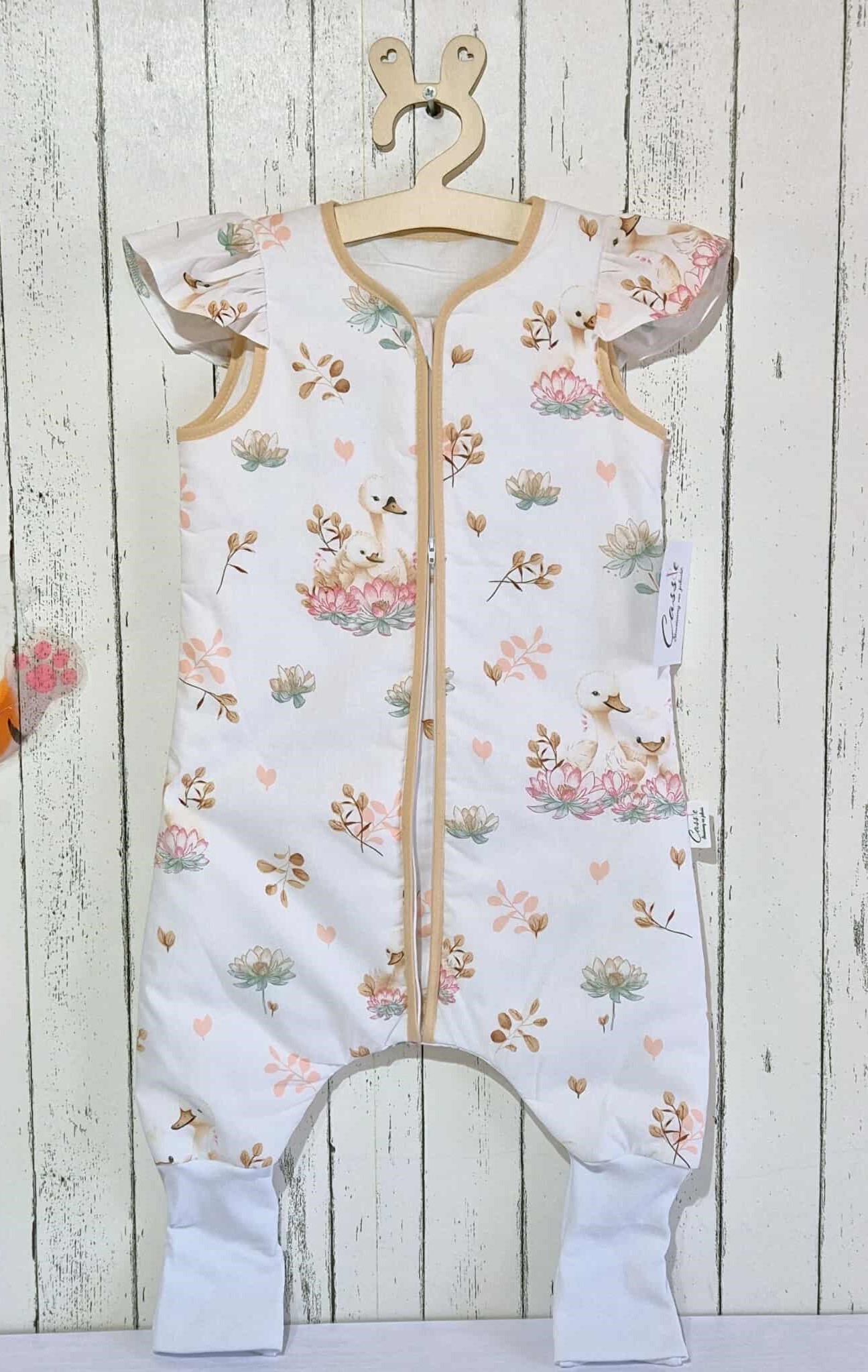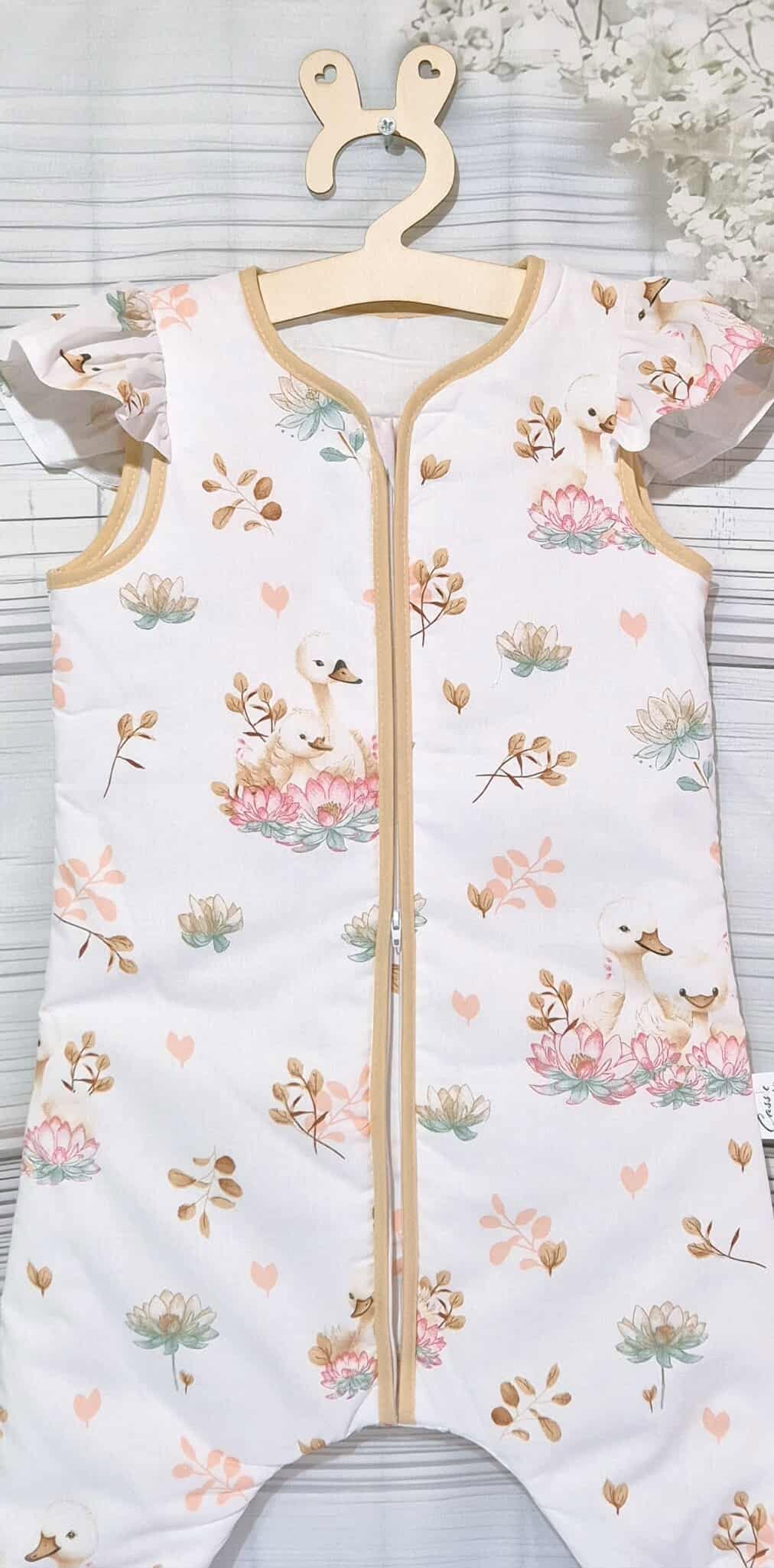 Śpiworek z nogawkami i falbanką ,wzór – Łabądki z falbanką